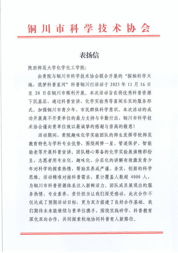 依托大学生科技社团支持计划,于11月16日至11月20日赴铜川市开展系列科普活动。此次活动通过主题科普宣讲、趣味实验外展、场馆参观调研,为铜川市科普事业注入新的活力,推动科技社团走出去,探索科普教育与教师培养的实践路径。