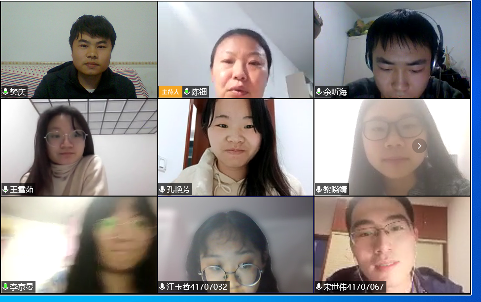 最后,陈钿老师对学生干部工作提出几点要求:第一、学生干部要心有大局,带头遵守学校的决策和部署,并在学生群体中做好宣传引导;第二、在线上学习期间,学生干部要以身作则,学好专业知识;第三、集思广益,创新工作思路,策划丰富有益的线上活动,有序推进学生会工作。此次会议不仅激发了学生干部们的工作动力,同时为接下来的工作指明了方向,学生干部们也将认真负责,在这场抗疫攻坚战中坚守学生工作根据地,用不懈努力为化院师生服务,为这场抗疫阻击战贡献青春力量。