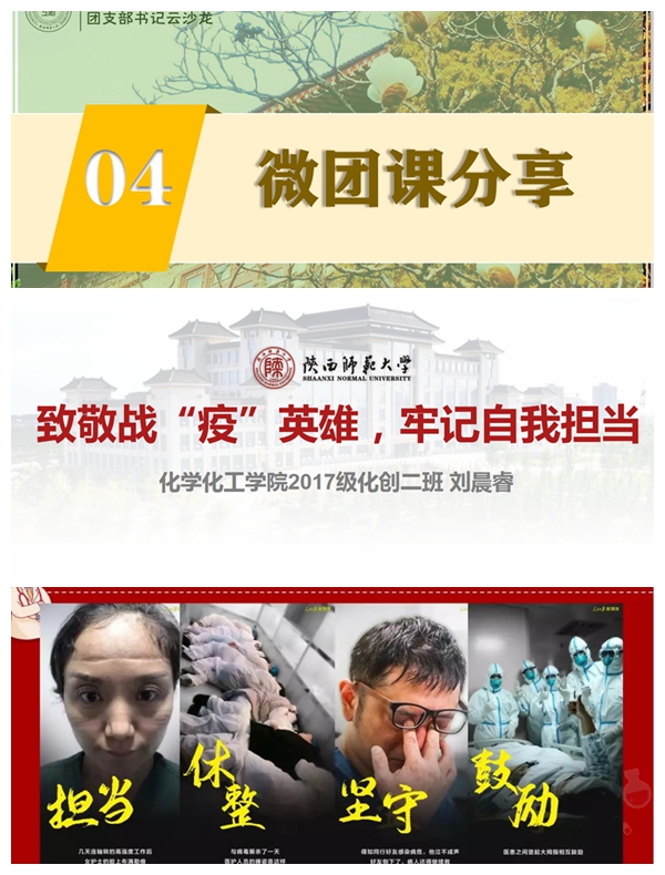 沙龙的第三个环节,由化学1904团支部书记常凯和化创1702团支部书记刘晨睿分别讲授了一节生动详实的微团课。常凯在微团课《致敬伟大逆行者》介绍了面对疫情防控责任,迎难而上的无数一线工作者的感人故事。刘晨睿在微团课《致敬战“疫”英雄,牢记自我担当》中分享了最让她感动的抗疫故事和本次疫情带给她的思考与改变,并表示会牢记自己的担当使命,用努力奋斗的青春回应时代的挑战。