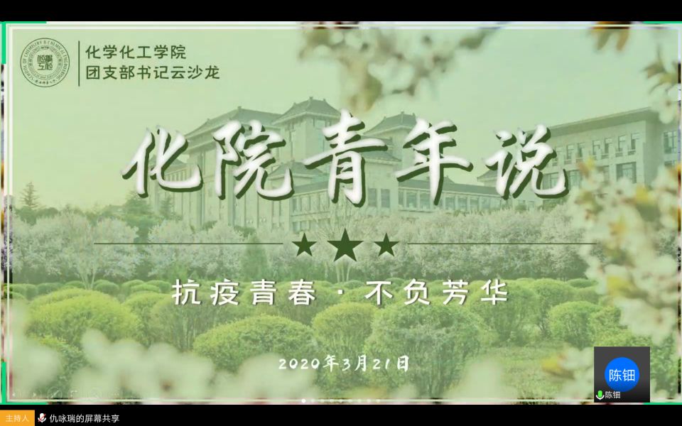团委通过腾讯会议在线开展了题为“抗疫青春,不负芳华——化院青年说”的团支部书记沙龙。会议由团委书记陈钿主持。十博
