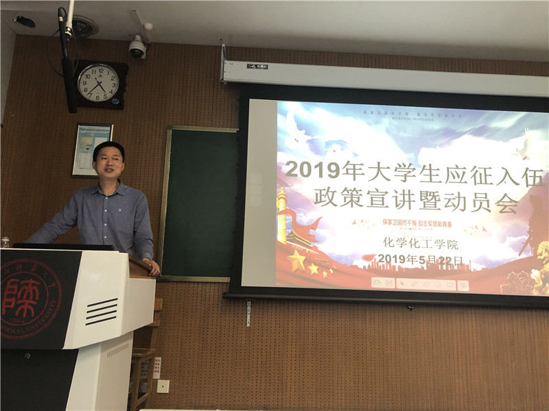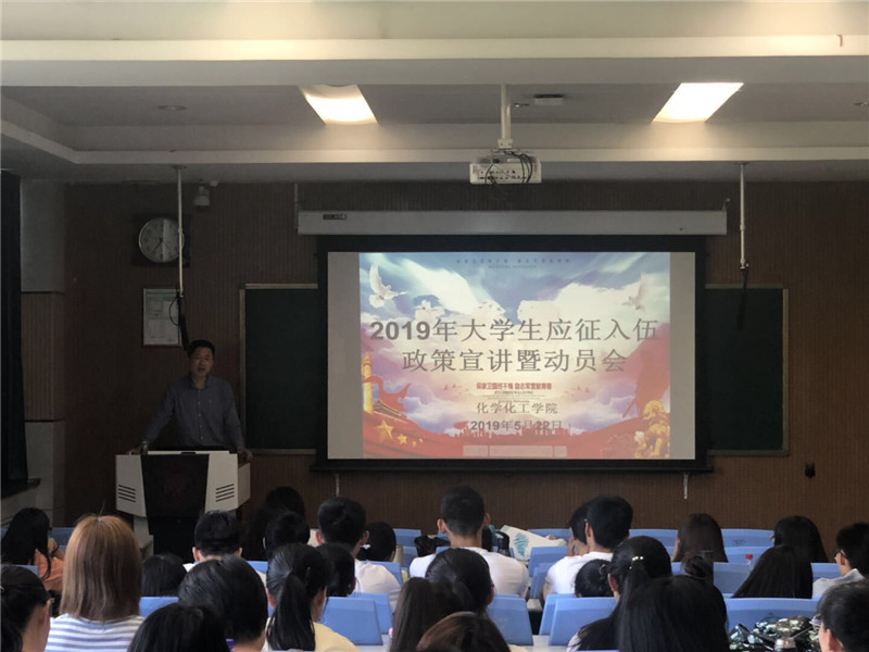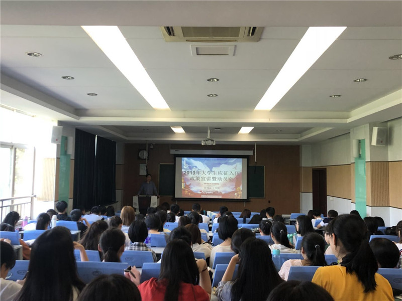 2019年征兵入伍宣传工作,帮助学生了解相关征兵政策,动员适龄热血青年积极投身军营、报效祖国,5月22日下午16:30,大学生应征入伍政策宣讲会在雁塔校区教学四楼举办,宣讲会邀请到我校武装部国防教育科科长秦维亭,2017级辅导员龙卓华、2018级辅导员翁思洁和100多名学生代表参加。