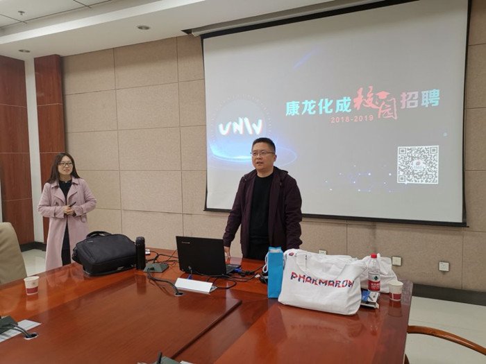 3月19日,康龙化成(北京)新药技术有限公司科研副总裁邓刚、分析部门总监胡增锋、人力资源部经理张晓虎、人力资源部秦国玲一行在致知楼1568室进行宣讲招聘,研究生辅导员牟朝丽及十博 2019届毕业生参加了此次专场招聘会。