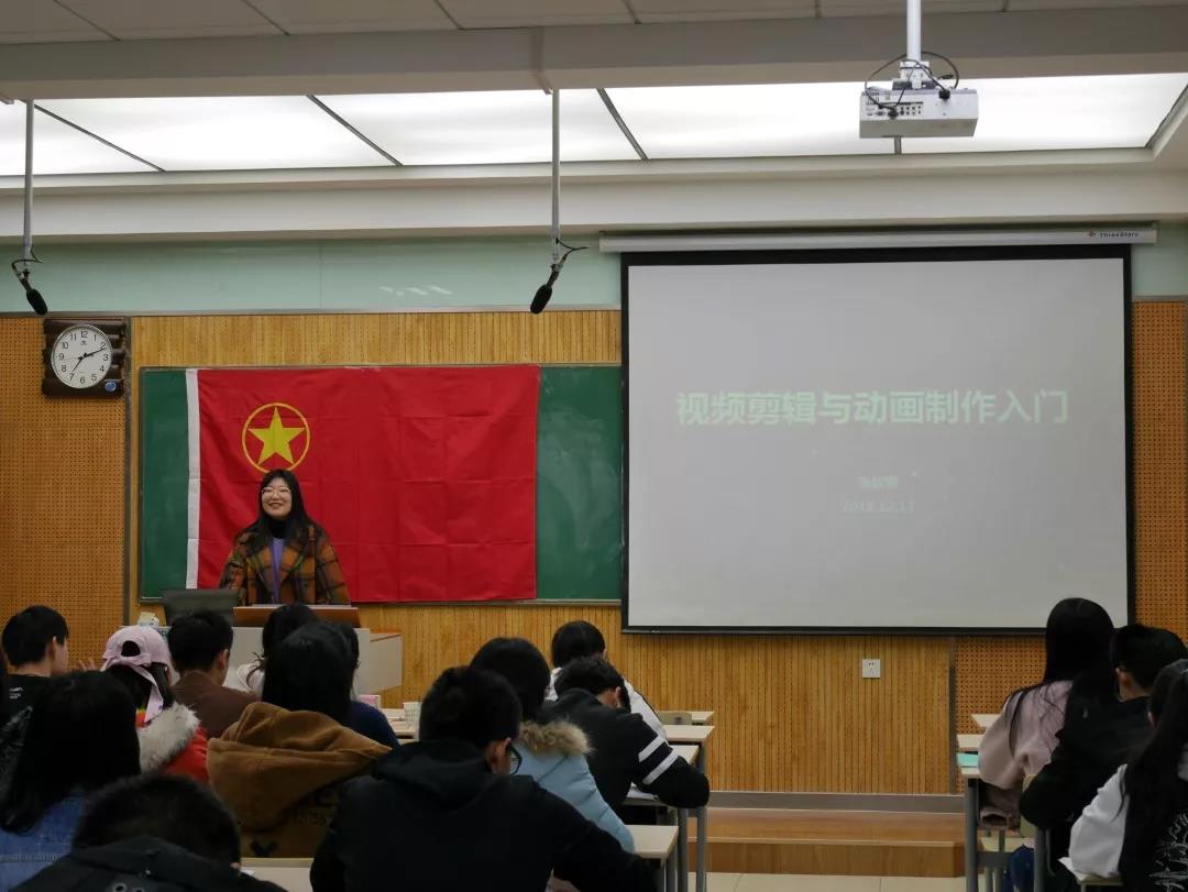 首先,张歆翊结合自己制作的视频与相关软件分别从视频剪辑的应用前景、工具商店、实操演示与玩转技巧等四个方面就视频剪辑与动画制作为同学们展开交流。