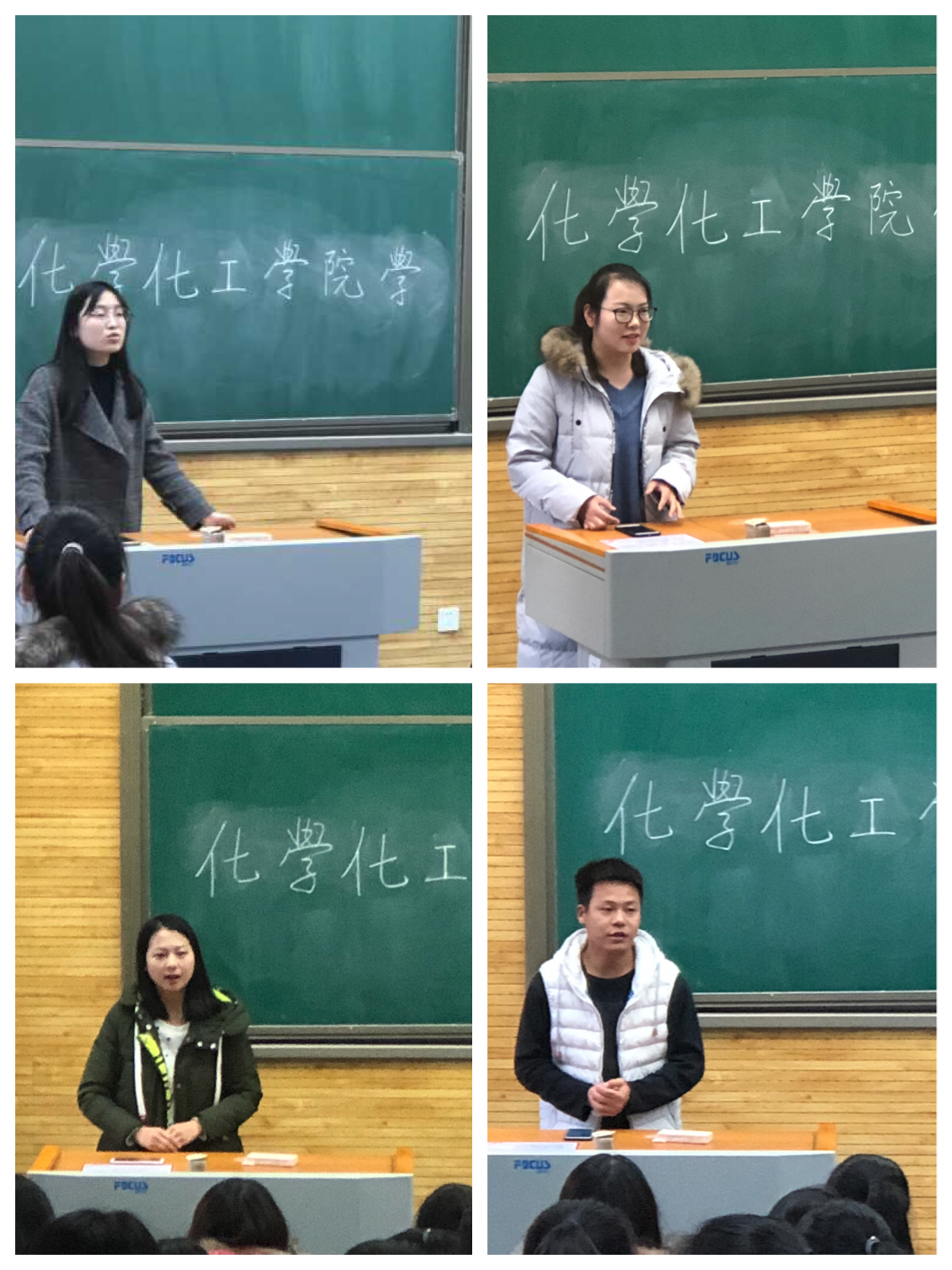 非师范生学长学姐见面交流会由2018级化学类3班班长赵子卓主持。来自2015级化学创新实验班的刘鑫同学、王希妍同学以及应用化学的何昌礼同学、佘文研同学与大家一起交流学习经验,分享他们大学四年的经历。他们就学习成绩、科研竞赛、学生工作、社会实践等方面与2018级非师范生们进行交流、解答疑惑,鼓励他们在认真学好专业课的同时,多参与实验项目和各类专业比赛,有效利用图书馆等互联网资源以拓宽自己的眼界。
