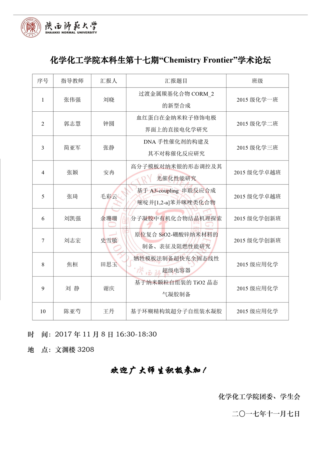 【通知】十博(10bet)亚洲官方网站 第十七期本科生“Chemistry Frontier”学术论坛