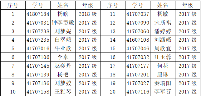根据《十博(10bet)亚洲官方网站 知心小筑关于开展“21天习惯养成计划”线上打卡活动的通知》,按照十博(10bet)亚洲官方网站 知心小筑关于开展“21天习惯养成计划”线上打卡活动志愿者招募条件,通过公开招募、自愿报名、择优录取,现拟定杨晗等20名同学为活动志愿者,名单如下,现予以公示:
