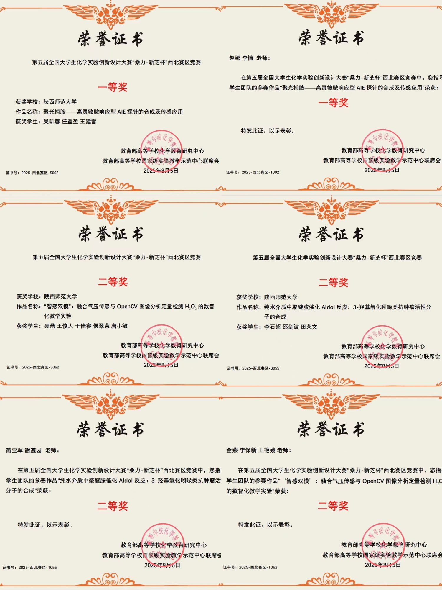 新创实验队凭借作品《聚光捕胺-高灵敏胺响应型 AIE 探针的合成及传感应用》,在总决赛中展现出突出的创新能力和实验设计水平,最终斩获全国一等奖。