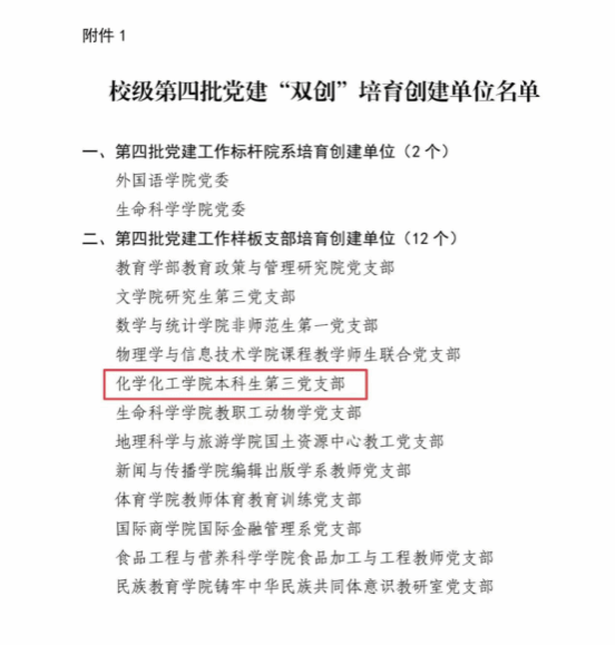 党委获批陕西省高校党建工作标杆院系、陕西高校先进基层党组织,教工无机化学党支部获批省级党建工作样板支部,教工无机化学党支部书记工作室获批首批全国高校“双带头人”教师党支部书记工作室,基层组织建设的带动引领和示范效应持续彰显。