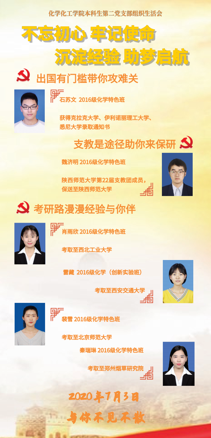 会议共分为三个部分进行。专题一:出国有门槛带你攻难关,邀请支部党员石苏文同志分享了出国留学的经验;专题二:支教是途径助你来保研,邀请了陕西师范大学第22届支教团成员,保送至陕西师范大学的支部党员魏济明同志分享了自己的支教团保研经历;专题三:考研路漫漫经验与你伴,邀请了支部党员肖雨欣(考取至西北工业大学)、雷藏(考取至西安交通大学)、裴雪(考取至北京师范大学)、秦瑞琳(考取至郑州烟草研究院)分享了考研复习经验。