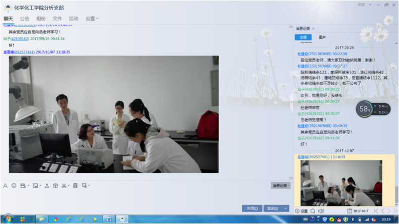 教工分析化学党支部在积极开展“两学一做”学习内容的同时,为了更好的展开各位党员之间的学习,支部的委员积极建立了QQ群和微信群,利用互联网,全方位的开展学习工作,学习的各项内容可以随时上传到群里面,方便每一位党员老师学习,同时也可以在微信群上随时交流各位党员老师的学习心得,微信群上会经常设定一定的话题诸如“教师上课传递消极言论是否合适?”及一些很典型的社会现象展开讨论,大家各抒己见,在讨论的过程中更好的提高每位党员的思想觉悟,将党员老师的责任感随时加强。有时微信群上的话题也会邀请非党员老师参加,也可以将不同教师的觉悟在思想层面得到进一步提高。