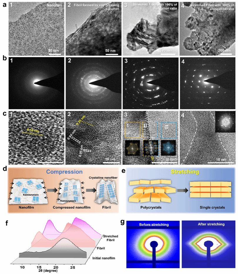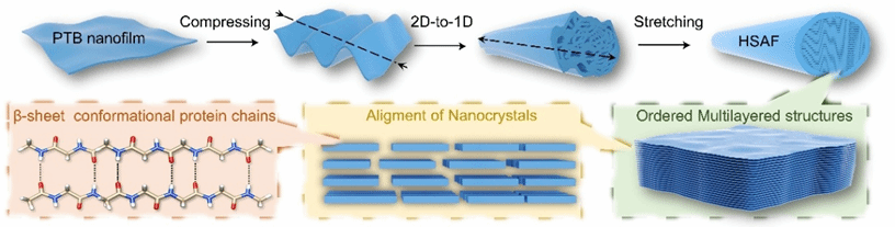 该工作开发了机械力导向的两步转化法,将蛋白质纳米膜转化为具有多层动态适应间隙的分级结构淀粉样纤维(HSAF),实现纤维内矿化。首先利用三(2-羧乙基)膦(TCEP)诱导牛血清白蛋白(BSA)在气/水界面自组装形成蛋白质纳米膜。通过压缩与纵向拉伸的2D → 1D转变,将相变牛血清白蛋白(PTB)纳米膜重构为具有多层结构的HSAF。在此过程中,展开的蛋白链逐渐弛豫并形成各层内的有序β-sheet构象。这种晶体HSAF凭借分级多层结构以及内部亲水界面保持柔性。