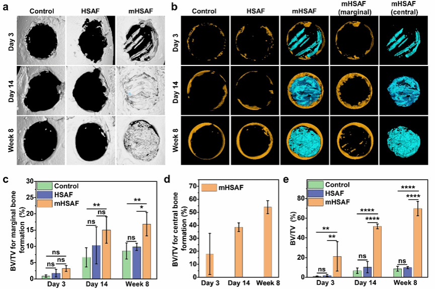 特别地,层间间隙区域由两个整合了聚丙烯酸(PAA)的亲水性负电荷β-sheet晶体界面构成,为HAP矿物提供有效的限域成核与定向排列环境。所得矿化的HSAF(mHSAF)凭借高度有序的蛋白质-HAP组装结构,其硬度(0.616±0.007 GPa)与模量(19.06±3.54 GPa)接近天然的生物硬组织水平,可用作再生材料。不同于以往通过调控局部缺损区炎症反应促进自体组织修复的研究,该材料在小鼠颅骨缺损模型中展现出双重生物活性:既能促进原生骨组织生长,又可引发HSAF进一步的纤维内矿化(由纳米级晶粒矿化为介观尺度晶体)。实验显示两周内实现54.3%的颅骨修复(短期快速封堵),八周达76.9%修复率,其短期快速封堵及长期有效促愈合的效果超越了已报道的3D打印及光热治疗生物支架。
