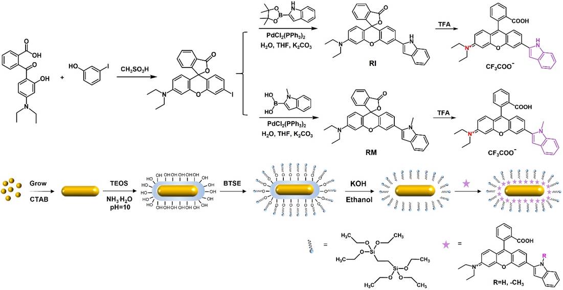 光热材料因其在能源转换、生物医学、环境治理等领域的广泛应用而备受关注。金纳米棒(GNRs)作为一种典型的光热材料,具有独特的局域表面等离子体共振特性,能够高效地将光能转化为热能,是光热领域的热点材料。然而,传统GNRs的光热性能受限于其光吸收效率和分散稳定性,难以满足日益增长的高效、稳定光热材料的需求。因此,如何通过合理的材料设计和功能化修饰,进一步提升GNRs的光热性能,成为当前研究的重要方向。有机染料种类多、光物理性质可调,可以通过分子结构精确设计,提升染料激发态的非辐射跃迁,获得高效光热转换。然而,有机材料通常面临光漂白问题,尤其是在固态应用中。本研究报道了一种简便有效的方法,通过将特别设计的有机光热分子修饰于GNRs表面,构建了兼具高效光热转换和优异稳定性的有机-无机杂化光热材料。