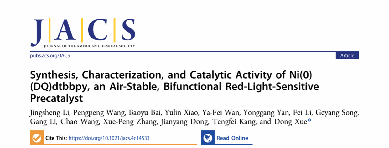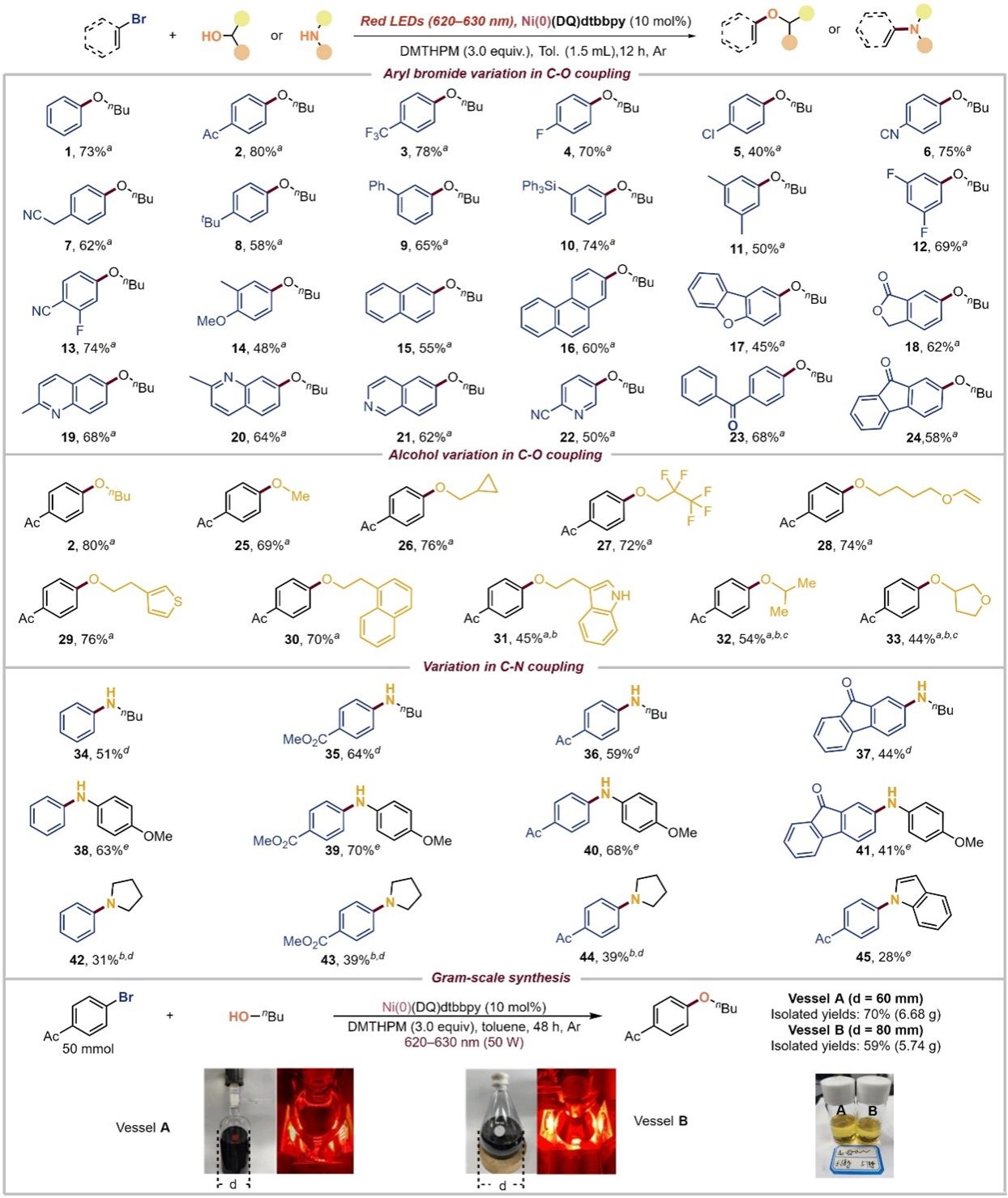 近日,绿色催化与合成团队薛东教授基于前期的研究基础(Angew. Chem. Int. Ed. 2020, 59, 12714; Angew. Chem. Int. Ed. 2021, 60, 5230; Angew. Chem. Int. Ed. 2021, 60, 21536; Angew. Chem. Int. Ed. 2024, 63, e202314355;J. Am. Chem. Soc. 2024, 146, 26936),成功合成并表征了一种新型双功能、空气稳定且对光敏感的镍(0)络合物 Ni(0)(DQ)dtbbpy(dtbbpy = 4,4’-二叔丁基-2,2’-联吡啶,Ni-1)。该镍(0)络合物在空气中可稳定储存数日,具有较高稳定性。该镍(0)络合物Ni(0)(DQ)dtbbpy展现出了独特的光敏性,在红光(620-630 nm)照射下,可以催化芳基溴化物与醇和胺的醚化和胺化反应。Ni(0)(DQ)dtbbpy起着作为光催化剂和活性金属催化剂的双重作用。与传统的短波长光(如紫光、蓝光)参与反应相比,该前催化剂能在红光(更低能量和更高穿透度)照射下展示出高的催化活性,从而能抑制各种副反应产生并使反应表现出广泛的底物普适性,这突显了Ni(0)(DQ)dtbbpy作为双功能、红光敏感催化剂在合成化学中的应用潜力。