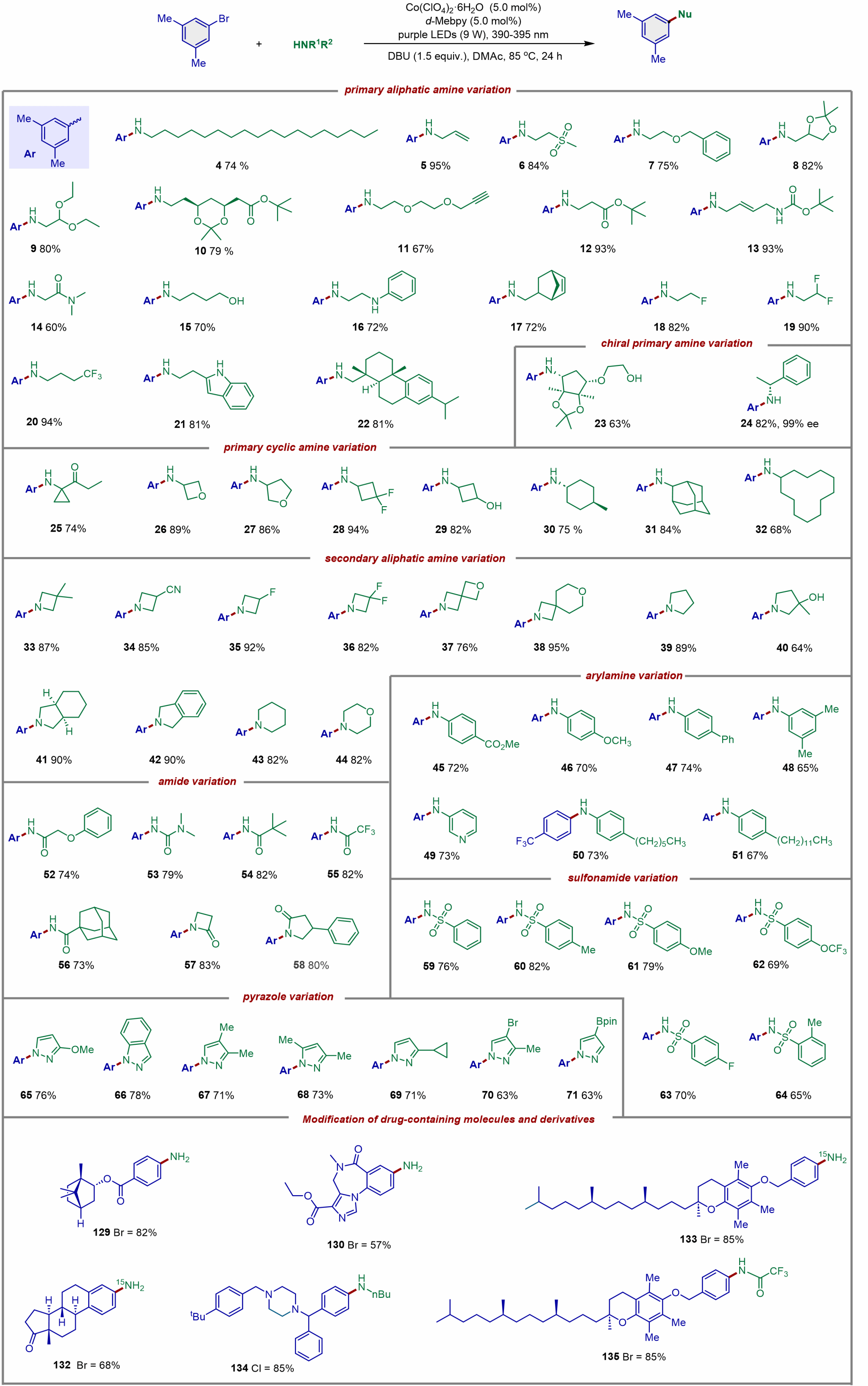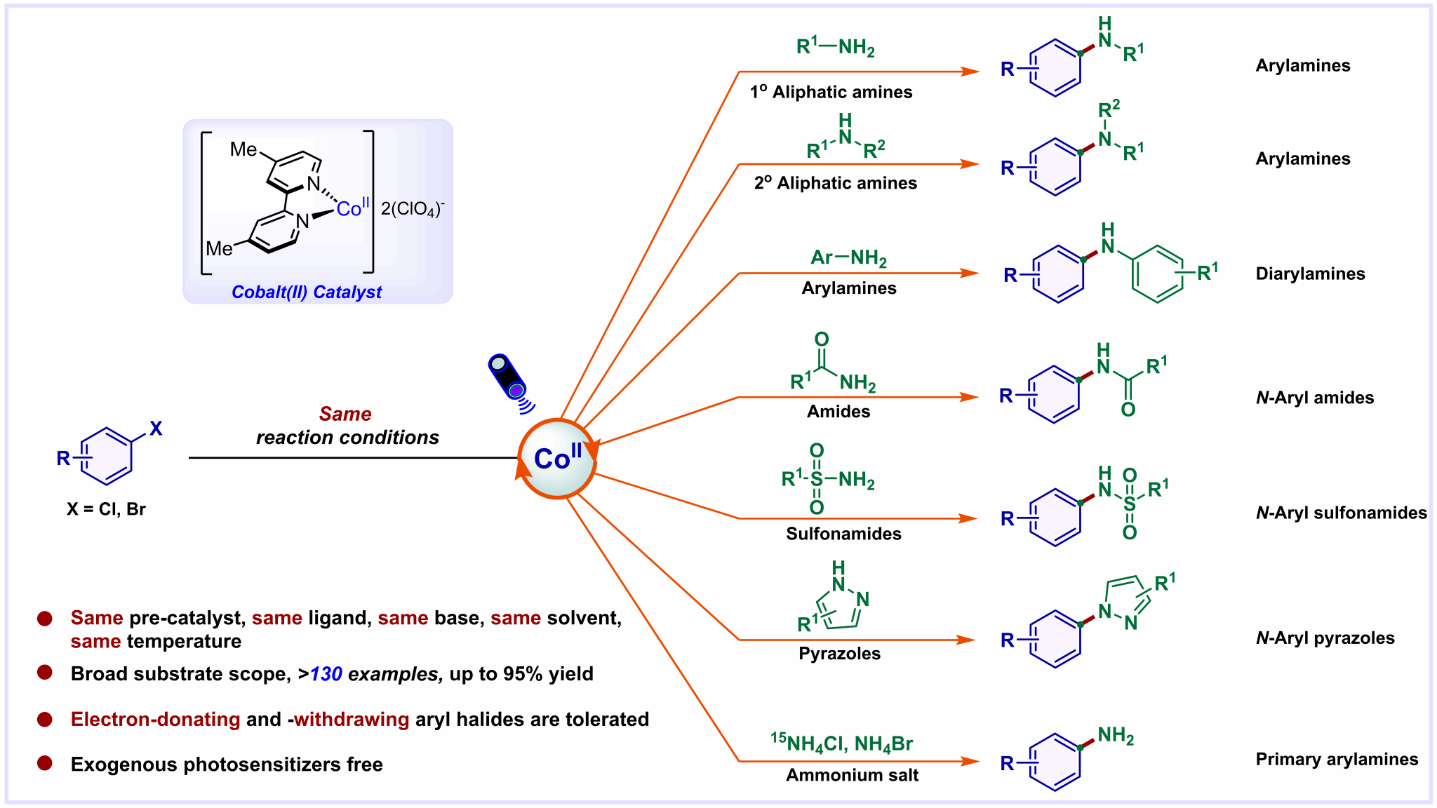 过渡金属催化的C-N偶联反应为芳胺及其衍生物的合成提供了重要方法,已成为药物合成领域最常用的20个反应之一。然而,默克公司(Merck)的研究表明:基于∼10000个实例的数据分析,C-N偶联反应的失败率仍然高达 35%。究其原因,目前广泛使用的过渡金属催化剂体系在很大程度上依赖于各种特定配体、前催化剂的设计、合成,以及针对不同类型的含氮底物开展的催化剂筛选和反应条件的逐一优化,导致缺乏通用性C−N偶联反应催化剂体系。为突破这一瓶颈,基于机器学习、人工智能与高通量实验(HTE)结合筛选反应条件的策略近年来得到了快速发展。考虑到C-N 偶联反应在合成化学中的重要性,开发通用性 C-N 偶联催化剂新体系(使用相同的前催化剂、配体、溶剂、碱和温度)为C-N偶联反应的发展提供了新的策略。钴(Co)是一种低毒且储量丰富的金属,由于其高的催化活性,钴催化剂被视为贵金属催化剂的理想替代品。Co催化剂在C-C键交叉偶联反应领域已经得到了广泛的应用,但是在构筑C-N键方面的应用还十分有限。陕西师范大学薛东课题组基于前期的研究基础 (Angew. Chem. Int. Ed. 2021, 60, 5230; Angew. Chem. Int. Ed. 2021, 60, 21536; ACS Catal. 2022, 12, 15590; ACS Catal. 2024, 14, 4968; Angew. Chem. Int. Ed. 2024, 63, e202314355),发展了基于钴催化剂的高效、自适应光化学 C-N 偶联反应新体系。该体系使用相同的钴源和配体,在相同的反应条件下(溶剂、碱和温度),无需外源光敏剂,实现了芳基卤化物与七种不同类型含氮亲核试剂(脂肪胺、芳胺、酰胺、磺酰胺、吡唑、铵盐)的C-N偶联(图1)。该光化学胺化反应中,单一钴催化剂发挥了双重作用:作为光敏剂吸收光和作为催化剂构筑C-N键。反应表现出优异的官能团耐受性,能够兼容挑战性的富电子芳基卤化物和邻位位阻的芳基卤化物,并实现了在药物分子合成中的应用(图2)。这项工作为发展通用性C-N偶联反应催化剂体系提供了新思路。