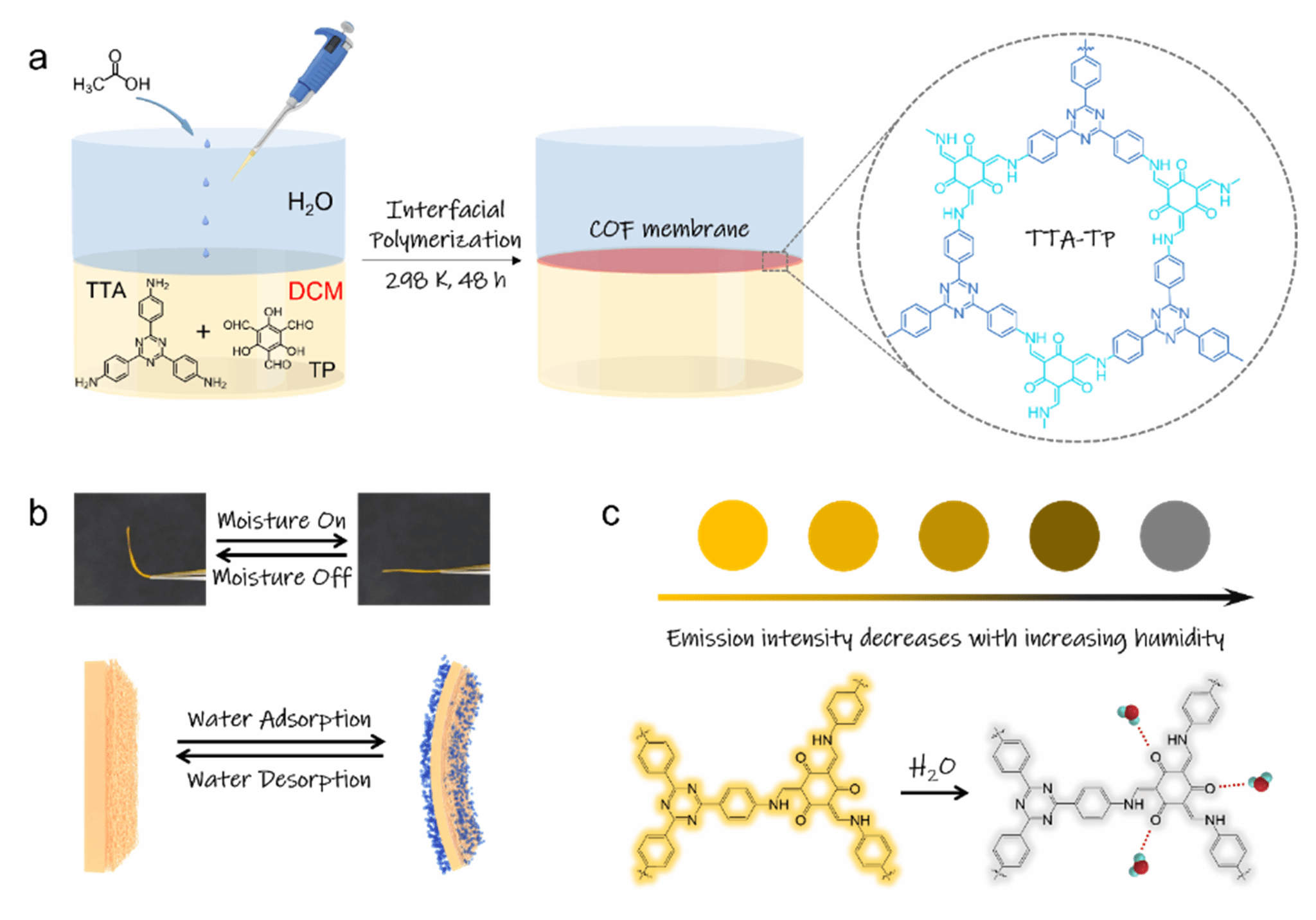 论文题目:Interfacially Fabricated Covalent Organic Framework Membranes for Film-based Fluorescence Humidity Sensors and Moisture Driven Actuators