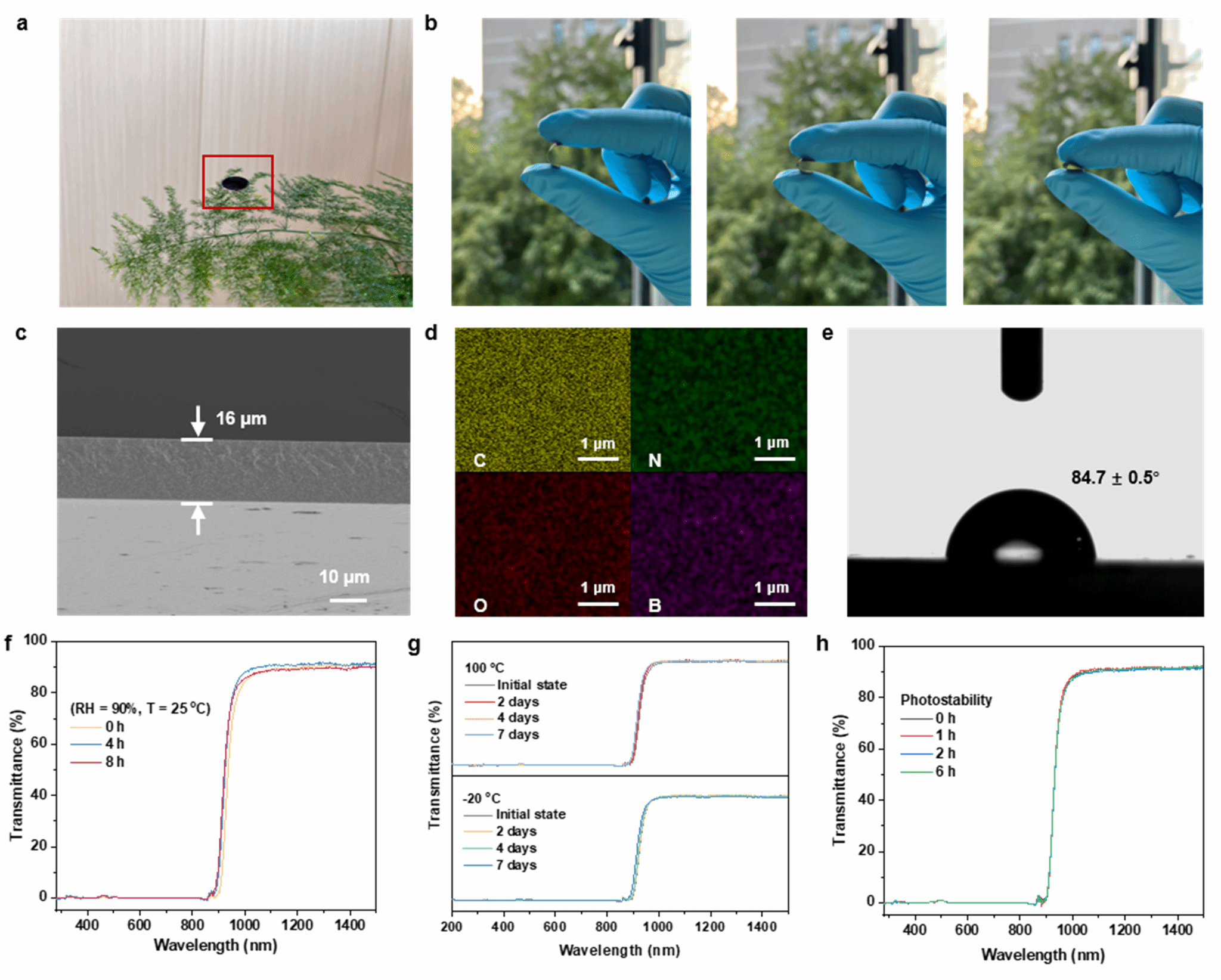 进一步对薄膜的柔性、均匀性以及稳定性进行了测试。弯曲试验表明NIR透过薄膜能够自支撑且具有柔性。通过截面扫描电子显微镜(SEM)测试得到薄膜厚度约为16 µm。随后,作者又将其分别暴露在90%湿度、100 oC高温或1 kW m-2的光照条件下,仍能保持光学性能的稳定。