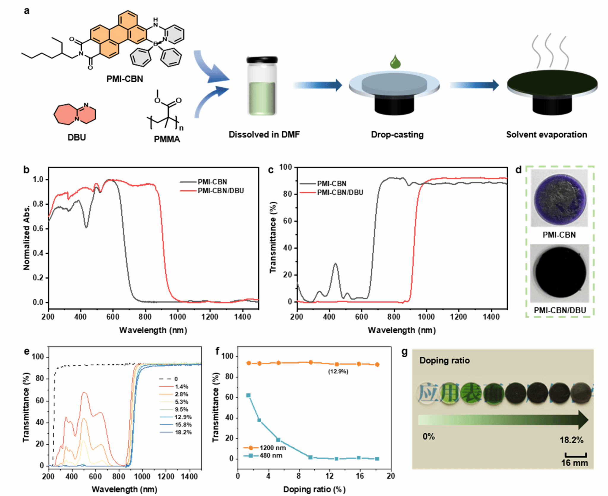 光子鼻与分子材料研究团队设计并合成了一种含苝单酰亚胺的新型四配位硼化合物PMI-CBN,通过去质子化诱导的分子内电荷转移机制,使得该化合物在709 nm至943 nm的波长范围内表现出红移吸收,将其与PMMA进行复合后,得到的薄膜在可见光区域几乎不透光(TVis < 1%),但在近红外区域具有极高的透过率(TNIR > 90%)。作者优化了PMI-CBN吸收剂在薄膜中的掺杂含量。随着PMI-CBN吸收剂含量从0增加到9.5 wt%,可见光透过率降低至1%,而近红外透过率基本保持不变,仅在截止波长处有轻微红移,薄膜颜色也从绿色逐渐变为黑色。