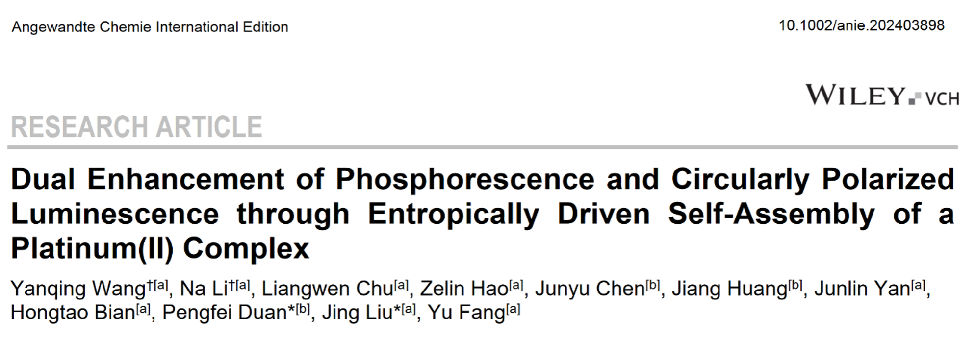 相关工作以“Dual Enhancement of Phosphorescence and Circularly Polarized Luminescence through Entropically Driven Self-Assembly of a Platinum(II) Complex ”为题发表在Angew. Chem. Int. Ed.上,硕士研究生王彦清和李娜第一作者,陕西师范大学刘静教授,国家纳米科学中心段鹏飞研究员为通讯作者。
