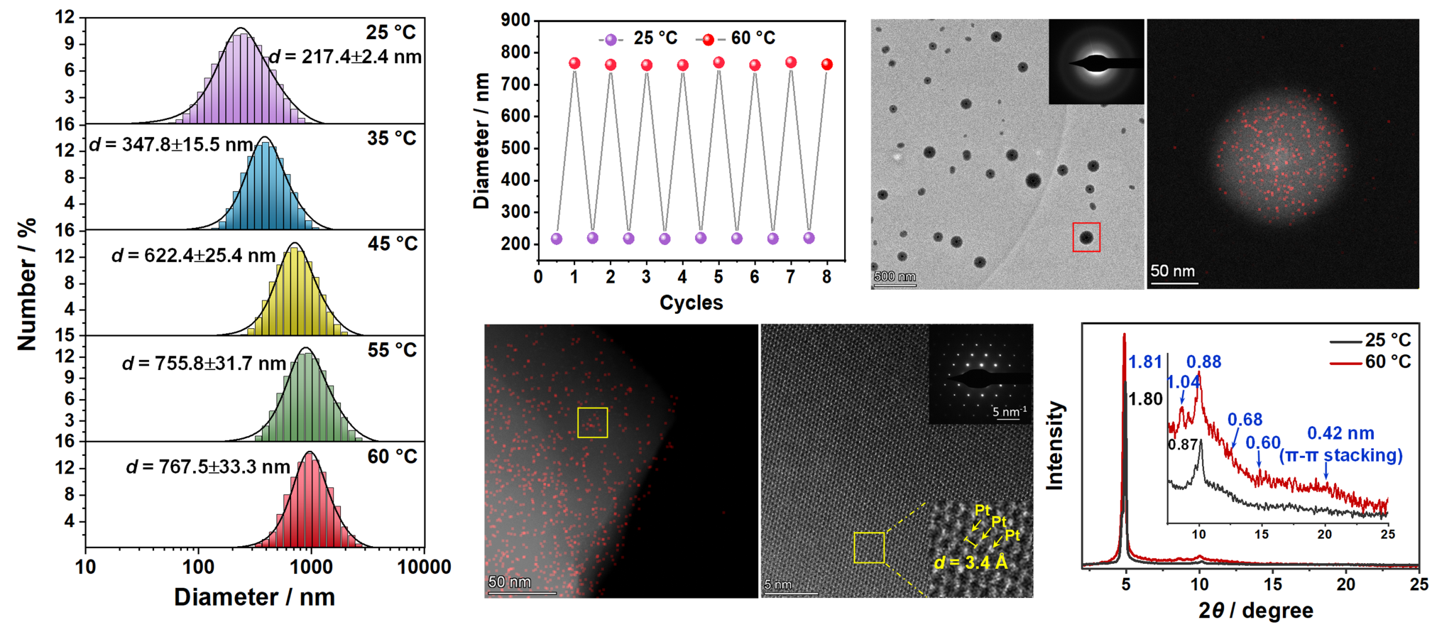 最近,光子鼻与分子材料科研团队的刘静教授和国家纳米科学中心的段鹏飞研究员合作,利用熵驱动自组装策略构筑了具有反常热响应特征的超分子体系,实现了glum和QY的同步增大。作者设计合成了含有手性中心、吡啶三氮唑三齿配体和三乙二醇(TEG)链的两性铂(II)配合物(L-Pt)。L-Pt在水/1,4-二氧六环中的自组装为熵驱动过程,即升温触发L-Pt分子组装成高度有序的纳米结构,相邻L-Pt分子间的激子耦合作用引起分子手性传递并被显著放大,同时Pt…Pt作用和π-π堆积显著增强了L-Pt组装体的QY:当体系温度从25 °C升至60 °C时,QY从15%增加至53%,同时glum从0.04×10-2 升高到 0.06,而且该敏化过程可以通过改变温度而调控,实现了glum和QY的同步可逆变化,表明可以通过调控分子间弱相互作用实现体系光物理性质的智能调控。L-Pt固态自组装薄膜的glum和QY高达0.16和69%,显著优于其他CPL组装体系的手性发光性质。