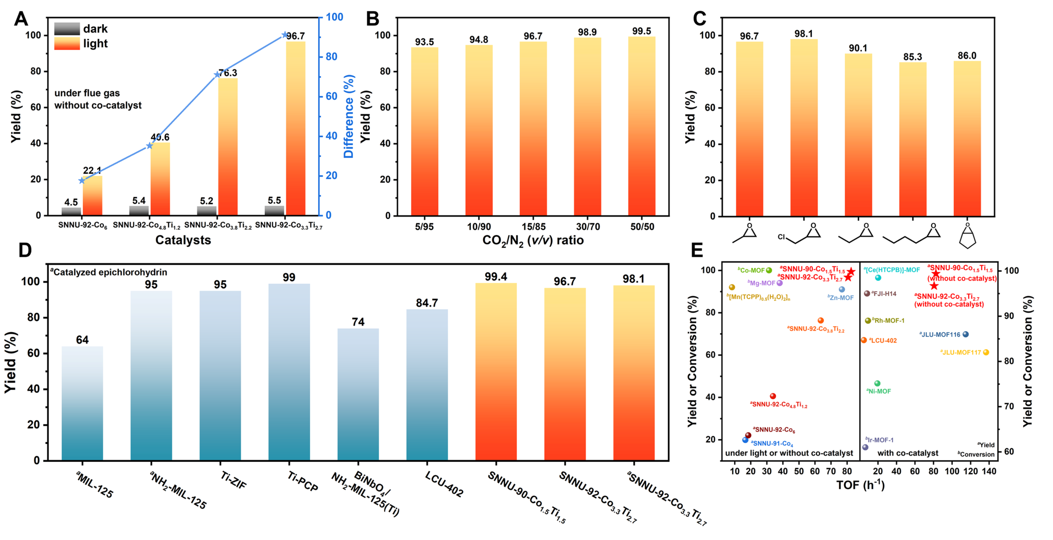 SNNU-92-Co6-xTix MOFs在黑暗条件下转化烟道气和环氧丙烷为环状碳酸酯(CCs)都显示出较低的产率(图5A)。在光照条件下,所有催化剂的光催化性能都得到了改善,SNNU-92-Co3.3Ti2.7的产率高达到96.7%,分别是SNNU-92-Co6(22.1%)和SNNU-91-Co4(19.9%)的4.4倍和4.9倍。并且随着CO2浓度的增加,产率可提高到99.5%(图5B)。SNNU-92-Co3.3Ti2.7催化不同底物的产率表明,长烷基链和大位阻基团会导致产率降低,这表明该框架对环氧化物底物具有筛分作用(图5C)。在光照条件下,SNNU-90-Co1.5Ti1.5和SNNU-92-Co3.3Ti3.7的产率分别是商用TiO2(P25)催化剂的10.6倍和10.3倍,并且优于该类型的MOF催化剂,显示出巨大的工业应用潜力(图5D和5E)。