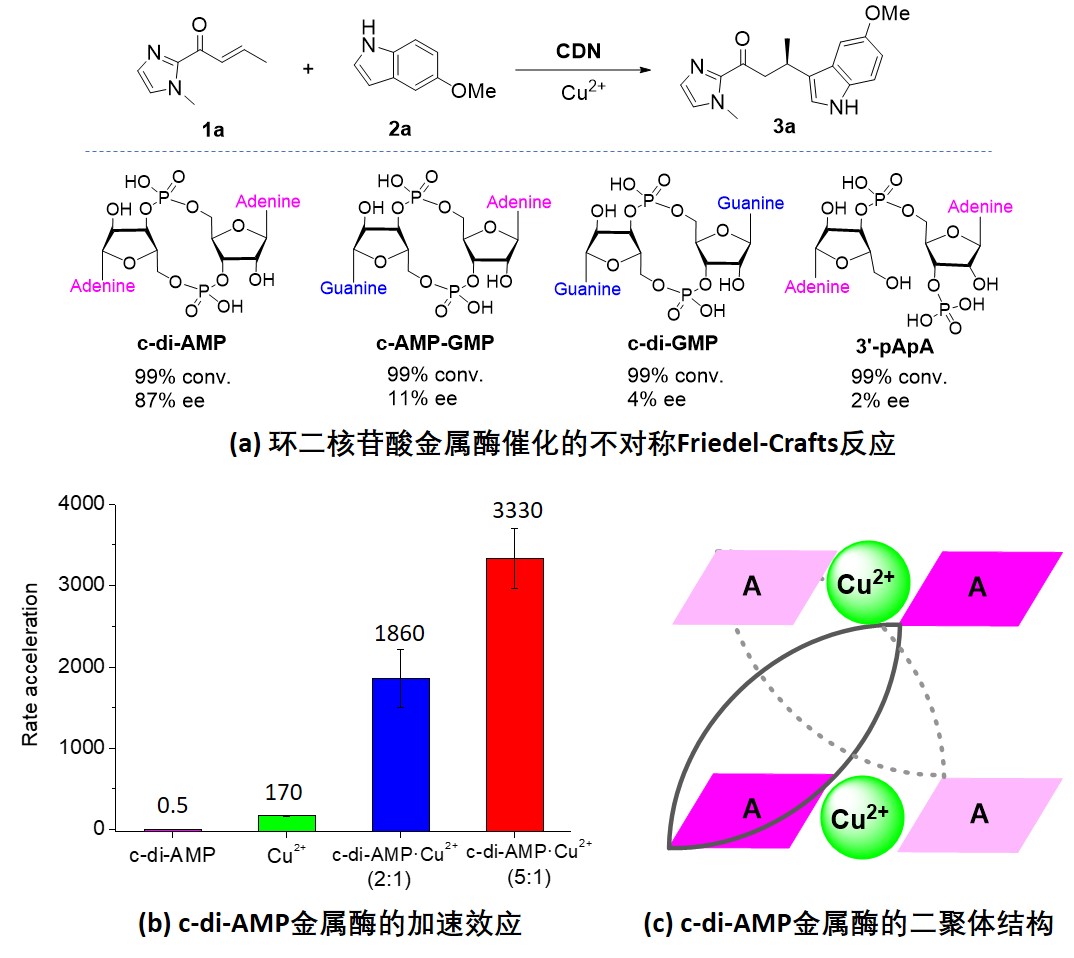 环二核苷酸(CDNs)是一类天然的环状RNA分子,它们含有两分子的核糖核苷酸和一个12元环结构。它们在自然界中作为第二信使分子参与信号传导和调节生理过程,但是,关于CDNs的催化功能研究尚未见报道。CDNs在不同的条件下可以形成多种空间构型,这为发展基于CDN的人工RNA金属酶提供了手性骨架。本课题组在研究中发现一种含有两个腺苷酸的环二核苷酸c-di-AMP和Cu2+离子能有效组装成人工RNA金属酶,对水相中的不对称Friedel-Crafts反应表现出高的反应活性和优异的手性选择性,最高ee值达到97%。相比空白反应,人工c-di-AMP金属酶提高反应速率3000倍以上。与单独铜离子相比,人工c-di-AMP金属酶也可以提高反应速率近20倍。控制实验表明,人工CDN金属酶中的两个腺苷酸和12元环结构对于CDN金属酶的手性催化性能至关重要。光谱表征和DFT计算表明,两分子c-di-AMP和Cu2+离子组装成二聚体结构,其中两个来自不同c-di-AMP的一个A碱基形成平面结构。Cu2+离子位于A-A平面中间,通过两个A碱基的N7位和临近的磷酸基的一个氧原子相互作用形成人工c-di-AMP金属酶。本研究表明CDNs可以作为一类稳定的手性骨架用于组装人工RNA金属酶,未来有望解决更多类型的水相反应。另外,CDNs是一类天然环状RNA分子,本研究为发掘CDNs在自然界中的潜在催化功能提供了研究依据。