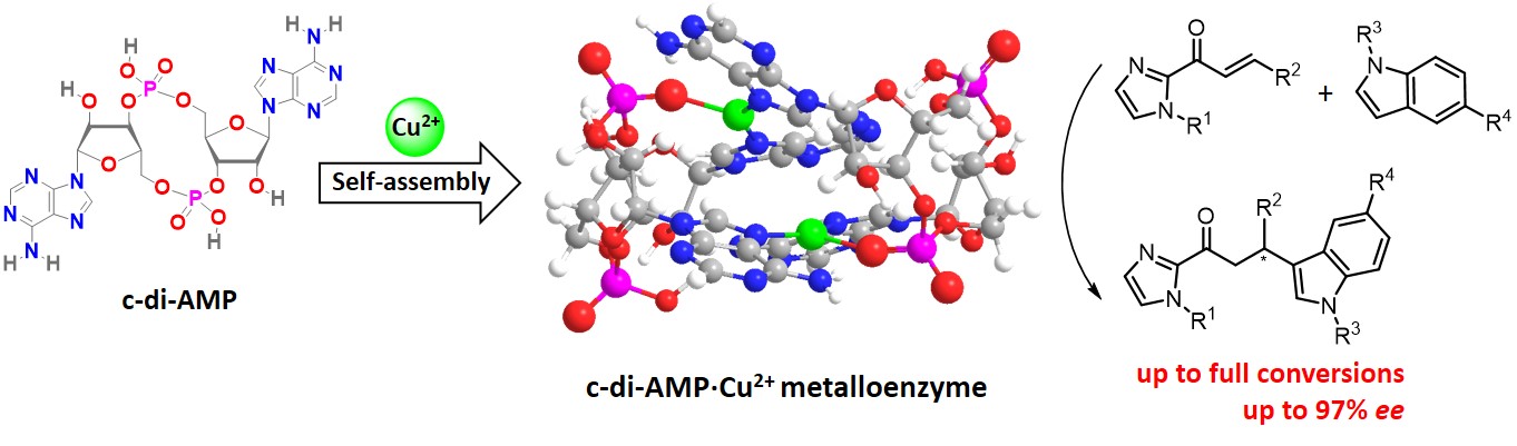 王长号副教授、陈亚芍教授和德国康斯坦茨大学Jörg S. Hartig教授、中科院大连化物所李灿院士合作发现一种环二核苷酸c-di-AMP和铜离子自组装形成稳定的人工RNA金属酶,对水相中的不对称Friedel-Crafts反应表现出优异的手性催化性能。