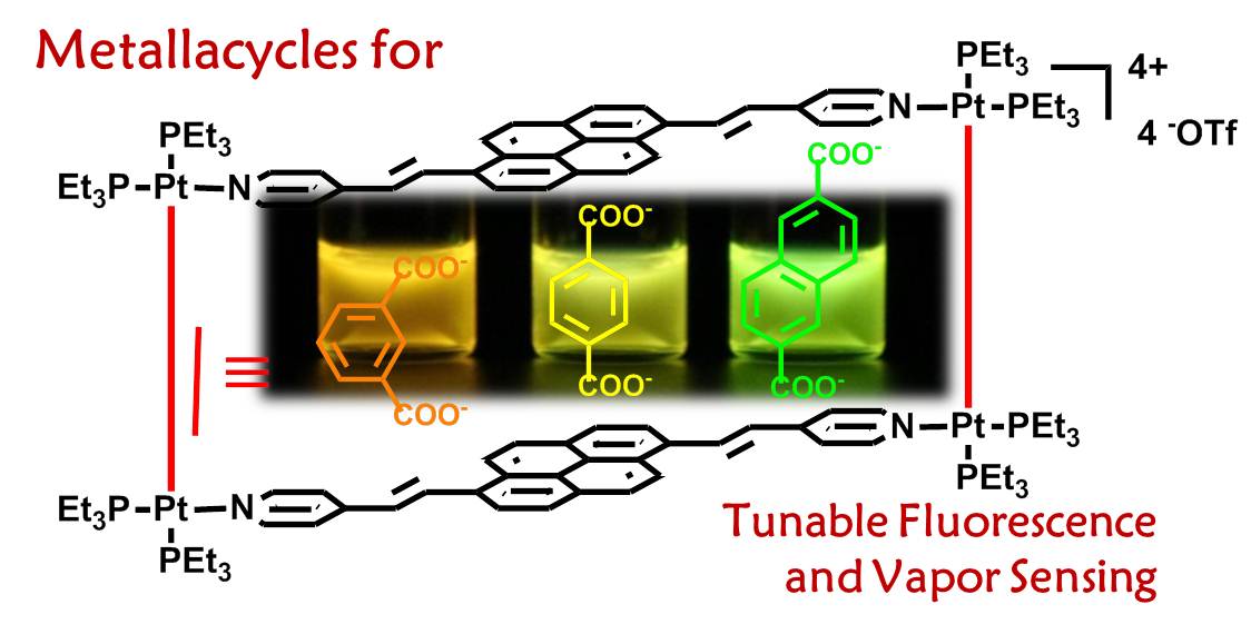 近两年来,房喻教授小组创造性地将非平面荧光单元引入薄膜结构,制备了一系列富含“分子通道”的荧光传感薄膜,实现了对多种有毒有害化学品的气相检测。在相关工作中,建立了利用薄膜表面的“毛细凝结效应”和“荧光单元的激发态微环境敏感性”设计制备高性能敏感薄膜材料的策略(Chem. Sci., 2018, 9, 1892-1901; Nature Commun., 2018, 9, 1695; ACS Appl. Mater. Interfaces, 2018, 10, 35647-35655; Anal. Chem., 2018, 90, 14088-14093; Chem. Commun., 2018, DOI: 10.1039/C8CC08399A)。在这些工作的基础上,房喻教授小组与美国犹他大学的Peter J. Stang教授合作,借助其定向配位构筑超分子复合物的策略制备了一系列具有荧光活性的金属配位大环,大环的形成赋予了荧光单元一系列优异的性质:(1)与配体相比较,金属配位显著阻碍了具有大共轭结构的配体间的pi-pi聚集,极大的增加了配体溶解性;(2)通过连接臂替换可以大范围调控体系的荧光行为;(3)与配体相比较,硅胶板担载金属配位大环的荧光量子产率显著提高;(4)硅胶板担载金属配位大环薄膜的荧光性质对芳香胺的存在十分敏感,据此,发展了灵敏度高、响应速度快、回复时间短,且可长时间稳定使用的薄膜基芳香胺荧光气相传感器。