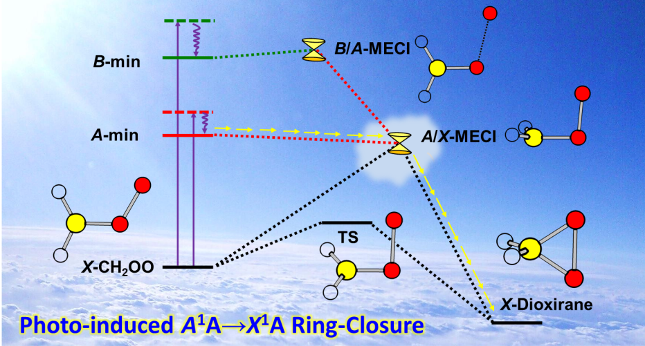 理论与计算化学团队采用多组态电子结构计算和面跃迁分子动力学,发现了最简单Criegee中间体的一个由A1A暗态参与的、异构化为环状双环氧乙烷(dioxirane)的可能光异构化途径。由B1A→A1A内转换得到或由选态激发获得的A1A态简单Criegee中间体分子,在面外旋转模式驱动下可经由A/X1A态间的势能面交叉(A/X1A-MECI),无辐射跃迁回基态,进而生成能量更稳定的双环氧乙烷。动力学计算表明,A1A态的激发态寿命为138 fs,而生成双环氧乙烷的时间为约254 fs。A1A→X1A 光异构化途径的发现不仅丰富了Criegee中间体的机理,而且可为其选态化学研究提供理论指导。