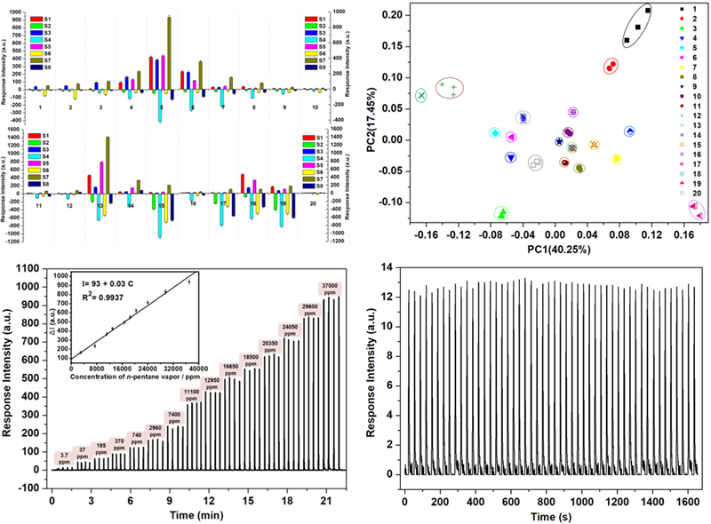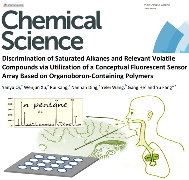 饱和烷烃是一类重要的信号物质,在消化系统、呼气系统某些疾病,特别是肺癌的早期诊断,油气资源的普查勘探中具有重要的意义。然而,饱和烷烃化学性质稳定,也缺乏光电活性,这就使得其原位在线高灵敏探测变得十分困难。针对这一挑战,房喻教授小组创造性将非平面荧光单元引入薄膜结构,制备了富含“分子通道”的荧光薄膜阵列,利用内聚能差异,薄膜通道的体积选择、极性选择,以及传感单元荧光量子产率的溶剂依赖性等,在自行搭建的系统上实现了对饱和烷烃的气相高灵敏选择性快速识别和检测。对肺癌标示物正戊烷的检测灵敏度可达3.7 ppm以下,系统响应速度小于1 s,且可实现稳定重复使用,有望在肺癌早期诊断中获得应用。该工作近期在化学领域顶级期刊《Chemical Science》上在线全文发表。论文第一作者为十博(10bet)亚洲官方网站