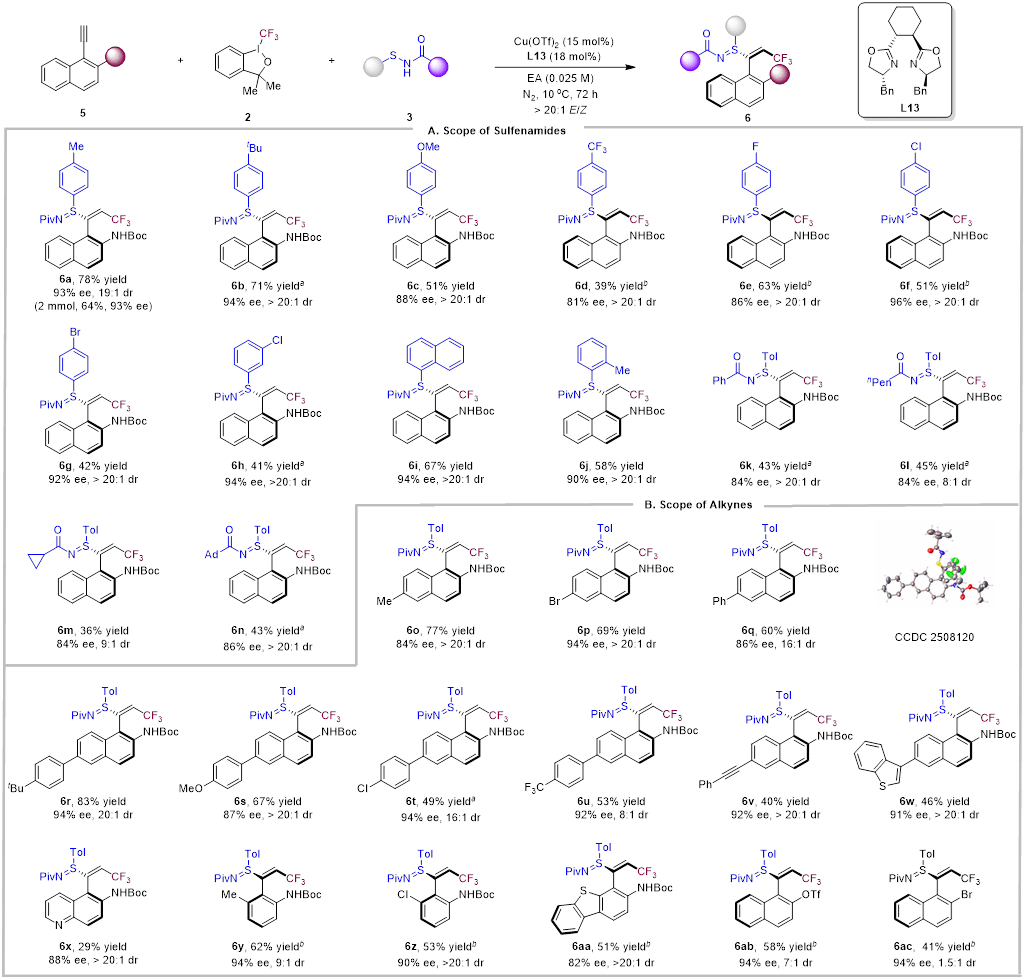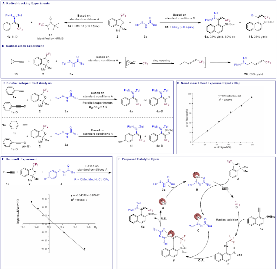 为阐明反应机理,作者进行了一系列机理实验。关键发现与结论如下:(1)自由基捕获实验和自由基钟实验,证实反应涉及自由基过程(图6A、B)。(2)氘代实验,平行动力学同位素效应(KIE)值接近于1(kH/kD = 1.0),且交叉实验中未观察到H/D交换产物,有力地排除了反应经由铜炔中间体的可能途径(图6C)。(3)产物6a的对映体纯度与手性配体L13的对映体纯度呈线性正相关,这一结果表明,在对映选择性决定步骤中,起催化作用的活性物种是铜与配体1:1配位(图6D)。(4)通过对不同对位取代的芳基次磺酰胺进行哈米特分析,得到了具有负斜率(ρ = -0.36)的线性关系。这表明富电子的次磺酰胺更有利于单电子转移过程以及随后的C–S键还原消除步骤(图6E)。基于上述实验结果及文献报道,作者提出了一个合理的反应机理:活性Cu(I)催化剂A与次磺酰胺3a经过S(II)/S(IV)互变异构-配位,形成Cu–硫亚胺物种B。B与三氟甲基化试剂2发生单电子转移,生成Cu(II)物种C和三氟甲基自由基D。自由基D对芳基炔烃5a进行自由基加成,产生芳基乙烯基自由基E。该自由基被Cu(II)物种C捕获,形成手性Cu(III)中间体F,最后经由还原消除得到目标产物6a并再生Cu(I)催化剂A,完成催化循环。其中NHBoc基团中的N−H···F相互作用及其与配体骨架之间的空间排斥效应,在反应的立体化学控制中起到了关键作用(图6F)。