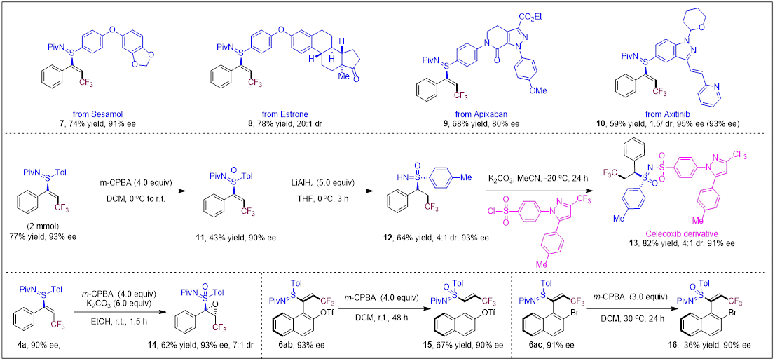该方法还可以应用于天然产物和药物活性分子的后期修饰。此外,产物4a经氧化得到六价手性硫化合物11,然后经脱Piv和双键氢化还原,最后成功与塞来昔布衍生物偶联获得药物衍生物13,展示其在药物化学中的应用潜力(图5)。