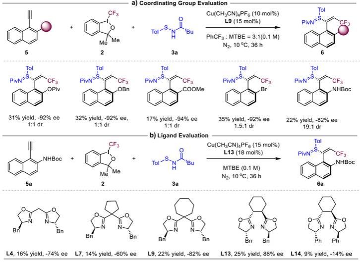 接着作者将该反应体系拓展到芳基烯基轴手性硫亚胺的构建。作者认为底物结构的选择对反应结果至关重要,因此首先对大位阻端炔进行筛选,发现不同大位阻端炔都能高对映选择性的得到目标产物,但仅NHBoc的大位阻端炔可以控制非对映选择性。在确定了定位基后,作者又对反应条件继续优化,最终确定了反应的最优条件(图3)。