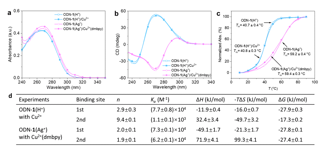 为理解手性反转现象,通过一系列物理化学技术手段对ODN-1(H+)与ODN-1(Ag+)的结构差异进行了分析。紫外可见滴定和圆二色滴定实验结果(图2a-b)表明Ag+离子破坏了ODN-1(H+)的螺旋结构及其C−H+−C碱基对堆叠,形成了具有特殊i-motif结构的ODN-1(Ag+)。熔点曲线(图2c)说明Ag+离子的添加增加了DNA的稳定性。最后,通过核磁滴定实验(图2d)确定Ag+离子依次破坏了ODN-1(H+)中的G:C:G:C四聚体和C−H+−C碱基对中的氢键。上述实验说明Ag⁺离子不仅显著稳定了i-motif结构,还重排了其螺旋拓扑结构和碱基堆叠模式。